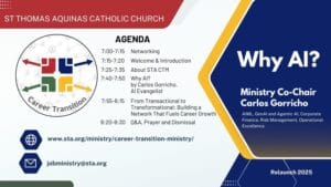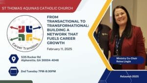 The Career Transition Ministry at St. Thomas Aquinas is volunteer led. Our mission is to support all job seekers with a program rooted in a Christian environment, open to everyone regardless of church affiliation. Through tailored training and mentoring sessions, we address the unique needs of each candidate. We provide a welcoming space to connect with other job seekers and ask essential questions, offering our proven “4 Strategies for Success” to empower them. Where appropriate we will introduce recent technologies in Generative AI to help the job seeker prepare their “Hiring Presentation” and grow their network into their next career embracing “Informational Interviews.”