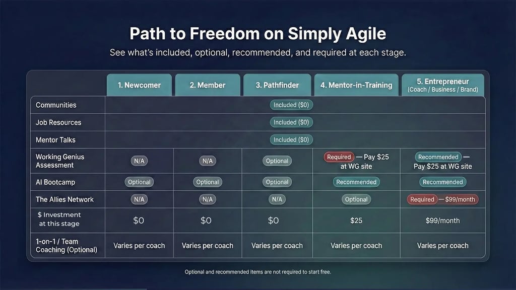 Simply Agile is a community of communities where your path begins free and grows as far as your vision takes you. You start by gaining clarity and connection, build skills and test your value in real time, then turn that value into sustainable income through structured stages designed for real growth.
