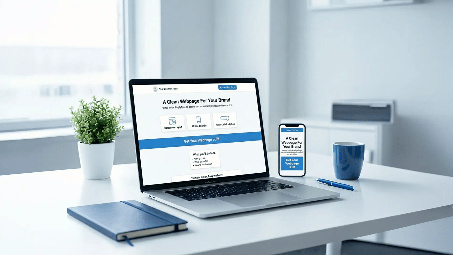 We create a single, modern webpage hosted inside SimplyAgile that loads fast, looks sharp on both laptop and mobile, and makes your offer easy to understand in seconds. It’s not a complicated website project. It’s a clean, structured page with the right sections, the right flow, and the right call-to-action, so people can find you, understand you, and take action without friction.